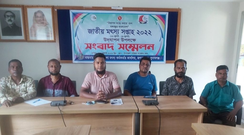 বাংলাদেশ মফস্বল সাংবাদিক সোসাইটির কেন্দ্রীয় যুগ্ন মহাসচিব, দৈনিক ভোরের কাগজ প্রতিনিধি রিয়াজ রহমান, জগন্নাথপুর প্রেসক্লাবের আহবায়ক কমিটির সদস্য দৈনিক নয়াদিগন্ত প্রতিনিধি মোঃ হুমায়ুন কবির, জগন্নাথপুর অনলাইন প্রেসক্লাবের সহ-সভাপতি মোঃ আব্দুল ওয়াহিদ, , সুনামকন্ঠ প্রতিনিধি মোঃ শাহজাহান মিয়া, অনলাইন প্রেসক্লাবের অর্থ সম্পাদক দৈনিক সিলেট বাণী প্রতিনিধি ও দৈনিক দেশ বাংলা টোয়েন্টিফোর ডটকমের সম্পাদক ও প্রকাশক হিফজুর রহমান তালুকদার জিয়া, দেশের কন্ঠ প্রতিনিধি বিল্পব দেবনাথ প্রমূখ। সংবাদ সম্মেলনে মৎস্য কর্মকর্তা আরো বলেন জাতীয় অর্থনৈতিক উন্নয়ন,আপামর জনগোষ্ঠীর পুষ্টি চাহিদা পূরণ, বৈদেশিক মুদ্রা অর্জন ও দারিদ্র বিমোচন ব্যাপক কর্মসংস্থানের সুযোগ সৃষ্টির লক্ষ্যে অপার সম্ভাবনাময় এই খাতের উন্নয়নে দেশের জনগণকে সচেতন করে মাছ চাষে উদ্ভুদ্ধ ও সম্পৃক্ত করার জন্য দেশব্যাপী জাতীয় মৎস্য সপ্তাহ ২০২২ উৎযাপন হতে যাচ্ছে।