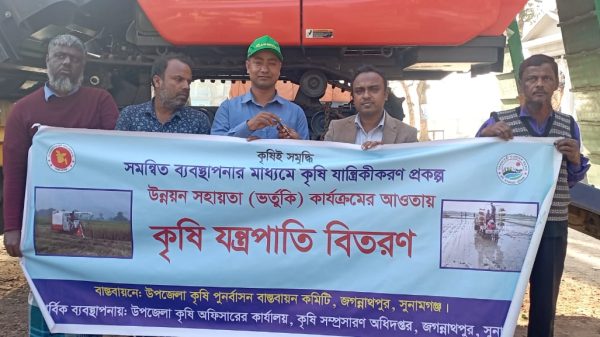 স্টাফ রিপোর্টার ::সুনামগঞ্জ জেলার জগন্নাথপুর উপজেলায় সমন্বিত ব্যবস্থাপনার মাধ্যমে কৃষি যান্ত্রিকীকরণ প্রকল্পের উন্নয়ন সহায়তা (ভর্তুতি) কার্যক্রমের আওতায় উপজেলা কৃষি পুনর্বাসন বাস্তবায়ন কমিটির উদ্যোগে একটি কম্বাইন হারভেস্টার মেশিন বিতরণ করা হয়েছে।